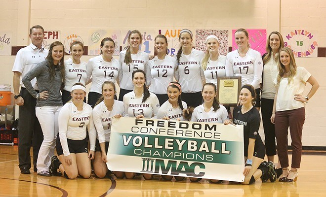 ST. DAVIDS, Pa. (Volleyball) – The top-seeded Eastern Eagles swept the second-seed DeSales Bulldogs 3-0 on Saturday to claim their seventh-straight Freedom Conference Volleyball Championship. The Eagles have won every tournament title since joining the conference in 2008.