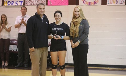Eastern jumped out to a 6-2 third-set lead before DeSales rallied back to come within 7-6. The Bulldogs fought late in the third set pulling within two points, down 19-17. But the Eagles were too much and hung on for a 25-19 third-set win and a 3-0 match victory.